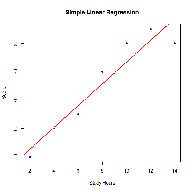 xlab = "Study Hours", ylab = "Score", pch = 16, col = "blue")